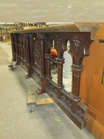 Altar Items and Sets → Miscellaneous — Altar Railing Set; Cross / Grapes; Gate on Each Item Number: 27234004 Category: Altar Items and Sets Miscellaneous Quantity: 1 Composition: Wood Color/Finish: Dimensions: 180" x 8" x 29" Condition: Fair Sacred Item: No Price: $1,500 *You can add an item to the cart and request more information or request to order the item.