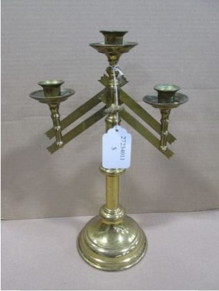 Candle Items → Candelabra — 3 Candle; Adjustable Item Number: 27234011 Category: Candle Items Candelabra Quantity: 1 Composition: Brass Color/Finish: Dimensions: 15" x 9" Condition: Fair Sacred Item: No Price: $200 *You can add an item to the cart and request more information or request to order the item.
