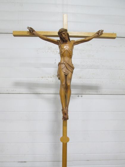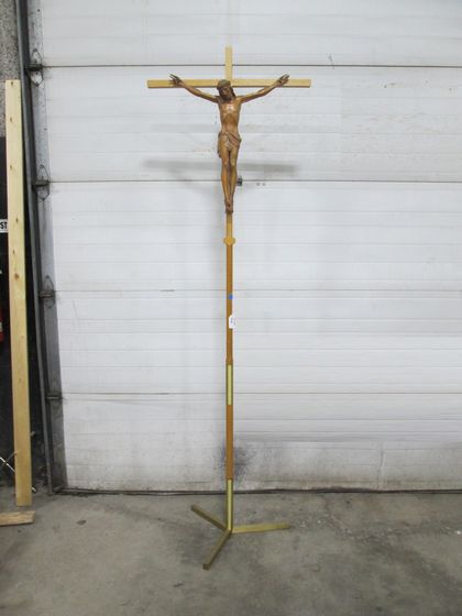 Crosses and Crucifixes → Processional Crosses — Removable at mid-point Item Number: 31312102 Category: Crosses and Crucifixes Processional Crosses Quantity: 1 Composition: Wood/Brass Color/Finish: Dimensions: 96" tall; 24" corpus Condition: Fair Sacred Item: No Price: $750 *You can add an item to the cart and request more information or request to order the item.