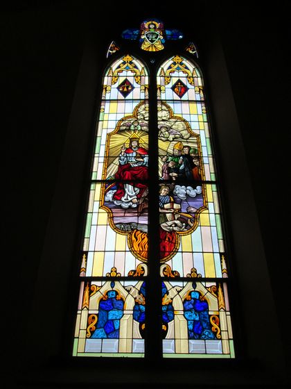 Mosaics and Paintings → Stained Glass — Jesus seated at the Right Hand of God This product has been sold and is no longer available Item Number: 60832149 Category: Mosaics and Paintings Stained Glass Quantity: 1 Composition: Glass / Lead Color/Finish: Dimensions: 20' 11" x 5' 7" Condition: Fair Sacred Item: No Price: $2,000