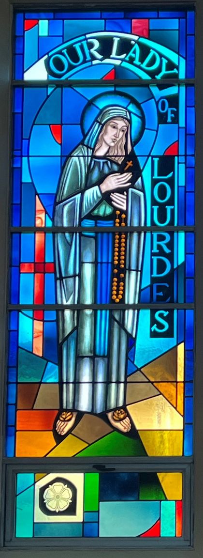 Mosaics and Paintings → Stained Glass — Stained Glass: Our Lady of Lourdes This product has been sold and is no longer available Item Number: 40563005 Category: Mosaics and Paintings Stained Glass Quantity: 1 Composition: Glass Color/Finish: Dimensions: Main: 91" x 38" / Vent: 13 1/4" x 34" Condition: Sacred Item: No Price: $2,500