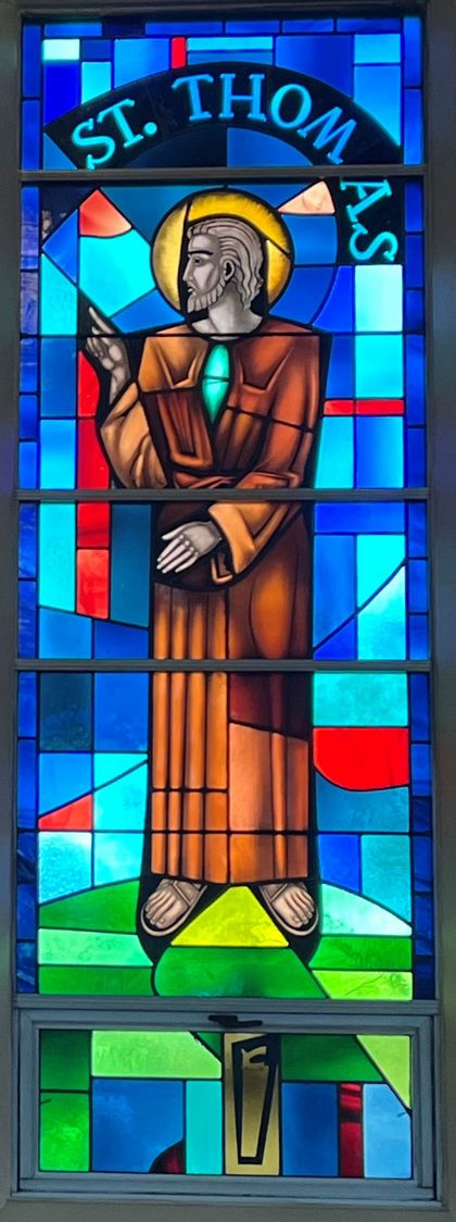 Mosaics and Paintings → Stained Glass — Stained Glass: St Thomas This product has been sold and is no longer available Item Number: 40563004 Category: Mosaics and Paintings Stained Glass Quantity: 1 Composition: Glass Color/Finish: Dimensions: Main: 91" x 38" / Vent: 13 1/4" x 34" Condition: Sacred Item: No Price: $2,500