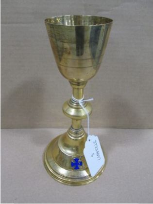 Sacred Vessels and Goods Vessels → Chalice — Blue Cross on Base; Node on Stem Item Number: 27234017 Category: Sacred Vessels and Goods Vessels Chalice Quantity: 1 Composition: Brass Color/Finish: Dimensions: 10" Condition: Fair Sacred Item: No Price: $200 *You can add an item to the cart and request more information or request to order the item.