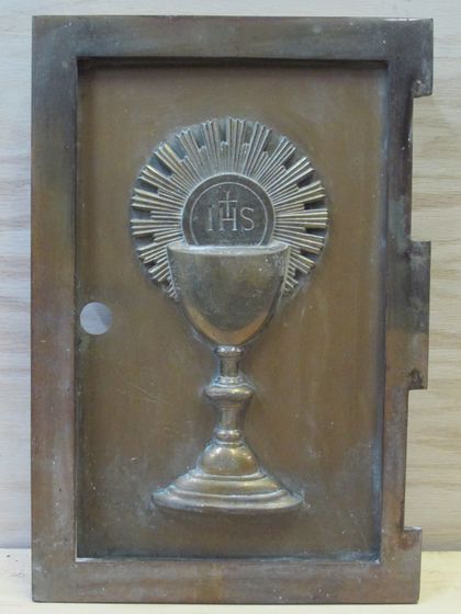 Sacred Vessels and Goods Vessels → Tabernacle — Chalice and host; door only This product has been sold and is no longer available Item Number: 52270136 Category: Sacred Vessels and Goods Vessels Tabernacle Quantity: 1 Composition: Brass Color/Finish: Dimensions: 12" T; 8" W Condition: Fair Sacred Item: No Price: $100