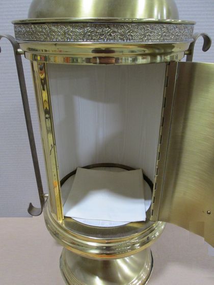 Sacred Vessels and Goods Vessels → Tabernacle — Chalice / Host on Door; Cross on Top; 1 Key Item Number: 10429019 Category: Sacred Vessels and Goods Vessels Tabernacle Quantity: 1 Composition: Brass Color/Finish: Dimensions: 15" x 12" x 30" Condition: Fair Sacred Item: No Price: $750 *You can add an item to the cart and request more information or request to order the item.