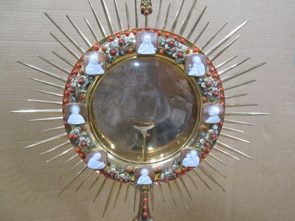 Sacred Vessels and Goods Vessels → Monstrance and Thabor — Clip-style luna Item Number: 31312111 Category: Sacred Vessels and Goods Vessels Monstrance and Thabor Quantity: 1 Composition: Sterling/Brass Color/Finish: Dimensions: 38" tall Condition: Fair Sacred Item: No Price: $3,750 *You can add an item to the cart and request more information or request to order the item.