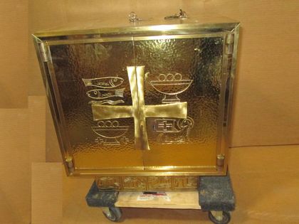 Sacred Vessels and Goods Vessels → Tabernacle — Loaves & Fishes Item Number: 31312110 Category: Sacred Vessels and Goods Vessels Tabernacle Quantity: 1 Composition: Brass Color/Finish: Dimensions: 18" wide x 13" deep x 21" tall Condition: Fair Sacred Item: No Price: $1,500 *You can add an item to the cart and request more information or request to order the item.