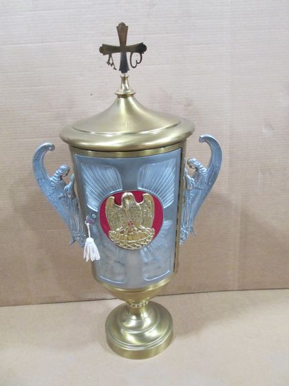 Sacred Vessels and Goods Vessels → Tabernacle — Pelican & Angels Design Item Number: 31312109 Category: Sacred Vessels and Goods Vessels Tabernacle Quantity: 1 Composition: Brass/Pewter Color/Finish: Dimensions: 33" to top of cross Condition: Fair Sacred Item: No Price: $1,000 *You can add an item to the cart and request more information or request to order the item.